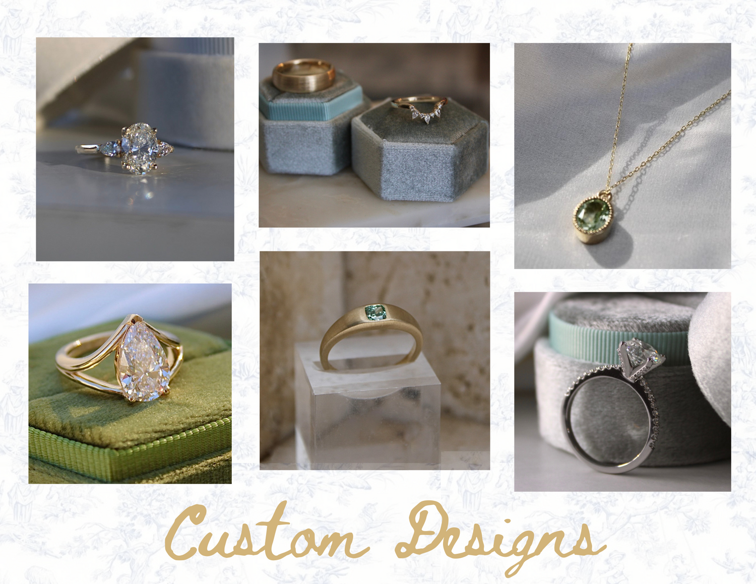 Let's chat - Each piece of custom jewelry that goes through our studio starts with a 30 minute Zoom call or in-person meeting. We'll start off with a sketch pad and brainstorming sesh. Once we have a rough draft and go over a few jewelry specific questions (style, stones, size, etc.), Sadie Jo will begin the design process.